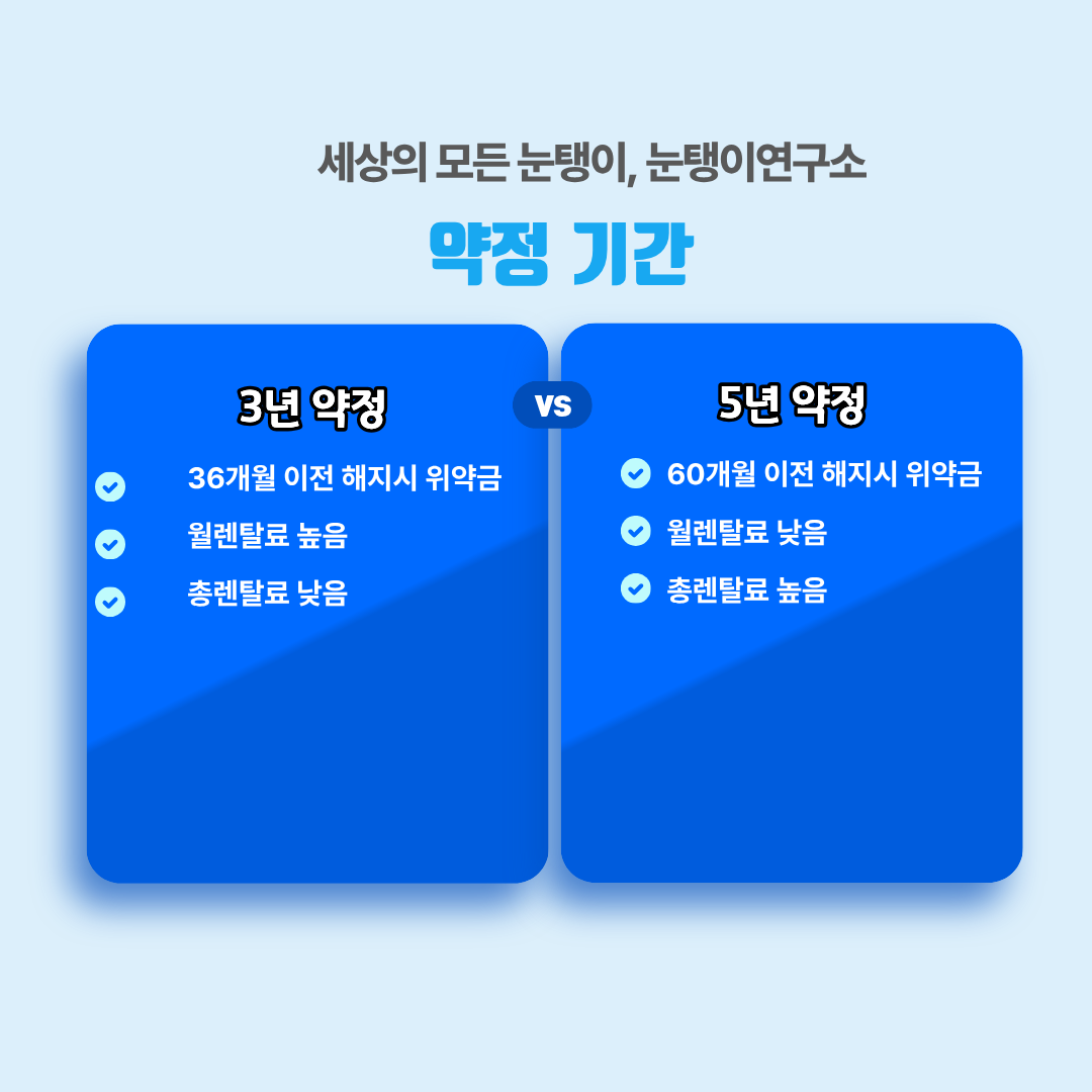 핵심: 예를 들어, "3년 약정, 5년 소유권 이전" 계약이라면 3년이 지나도 소유권은 여전히 회사에 있습니다. 약정 기간이 길어질수록 월 렌탈료는 낮아지지만, 총 렌탈료는 비싸진다는 점을 기억하고 신중하게 기간을 설정해야 합니다.