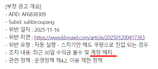 제재 내용: 최근 30일간 발생한 수익금 전액 몰수 및 파트너스 계정 즉시 해지